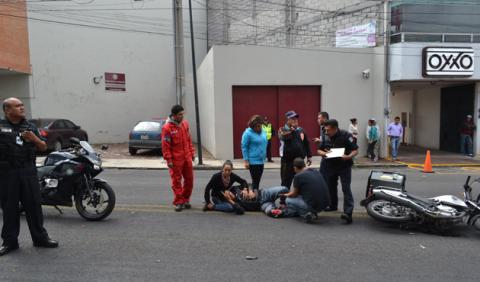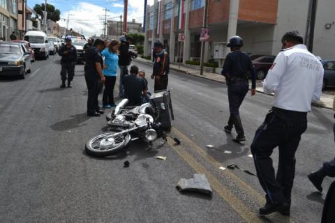 La policía municipal de Tlaxcala atendió a un motociclista, quien al circular con dirección al entronque de Ocotlán sobre el boulevard Tlaxcala-Chiautempan, no se percató de la incorporación de una camioneta a la vía y se estrelló de costado con la misma.
