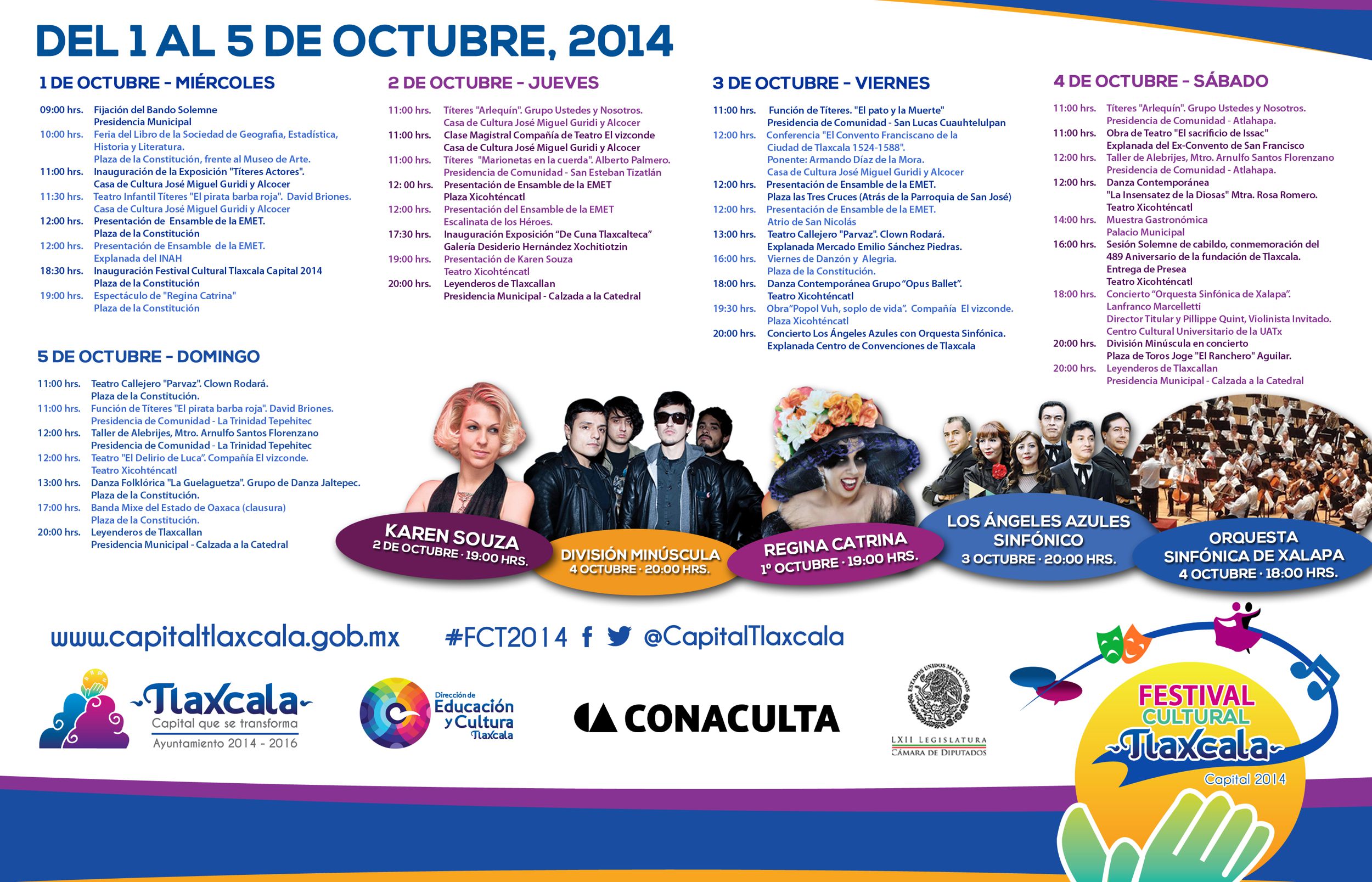 Escobar Jardínez enumeró que el Festival Cultural Tlaxcala Capital 2014 contará con la presentación de la Orquesta Sinfónica de Xalapa; el espectáculo “Regina Catrina”, el concierto de Rock de División Minúscula; la presentación de la cantante argentina, Karen Souza; la Guelaguetza, con el grupo de danza Jaltepec; la presentación de la banda de música regional oaxaqueña Mixe y; la danza contemporánea del “Opus Ballet”.