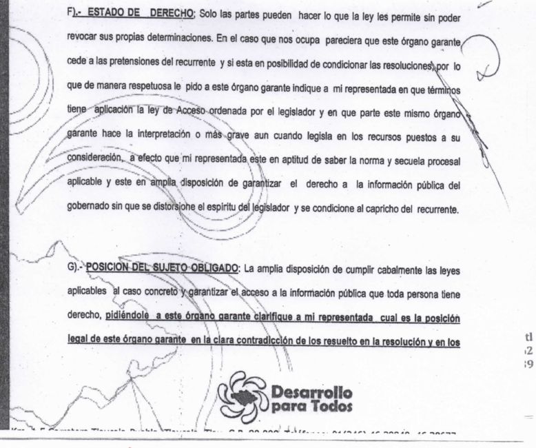 En respuesta por escrito que aluce la Secretaria hacia la CAIPTLAX deforma la petición original para cobrar por copias certificas, mismas que no fueron solicitadas y que la CAIPTLAX con el afán de cumplir con su importante misión instruye la consulta directa por la CMIC a las bitácoras de obra, a lo que la Secretaria alega que no tiene tiempo de atender dicha instrucción, demostrando así su falta de compromiso ante la transparencia y contraviene lo dispuesto por la Ley de Acceso a la información Pública que busca que toda persona pueda tener acceso gratuito a la información. “La versión que manifiesta la Secretaria es que el Articulo 164 del Código Financiero establece que los servicios que proporcione cualquier dependencia del estado por contraprestación deberá cobrar un salario mínimo por foja en copias certificadas, esta declaración no es aplicable ya que no es un servicio lo que se solicita, es simplemente acceso a la información. Estamos convencidos de que la Secretaria no ha tomado con la debida seriedad el ejercicio de los derechos ciudadanos a informarse, la pregunta que se realizó a la Secretaria ha tomado más de seis meses de tratamiento y aún no concluye”.