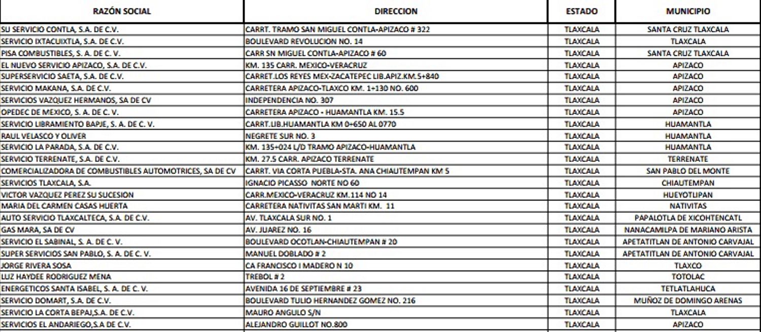 En el caso de Tlaxcala poco más del 50 por ciento de los centros de servicio presentaron este tipo de irregularidades, ya que de las 52 gasolineras en la lista 28 aparecen como estaciones que no estarían despachando completos los litros de gasolina, siendo recurrente en algunos casos año con año que aparecen dentro los que no dan “litros de a litro”.