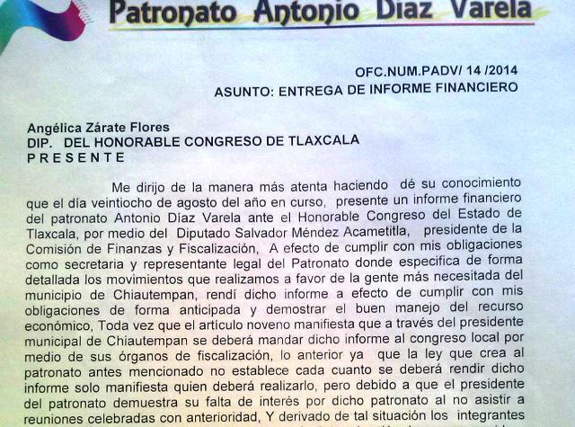Ante el desinterés del alcalde de Chiautempan Antonio Mendoza Romero, por conocer el estatus que guardan las finanzas del “Patronato Antonio Díaz Varela”, la síndico Belén Vega Ahuactzi, presentó informe financiero al Congreso local, en el que sobresalen apoyos económicos para la realización de eventos y demás actividades, que ascienden a 326 mil pesos.