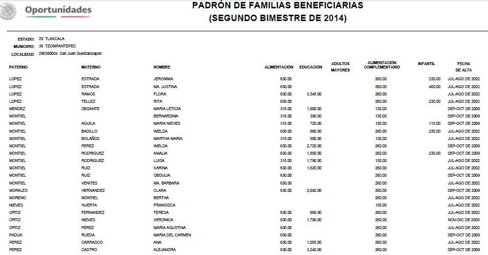 Conforme con los datos que proporciona esta lista, Montiel Bolaños cobra el apoyo del programa PROSPERA antes conocido como OPORTUNIDADES desde el bimestre julio- agosto del 2002, en donde la lista de beneficiarios revela que cobra 315 pesos por el rubro de Alimentación, 500 pesos por Educación y 130 pesos por Alimentación Complementario, en el mismo documento no aparece fecha de baja.