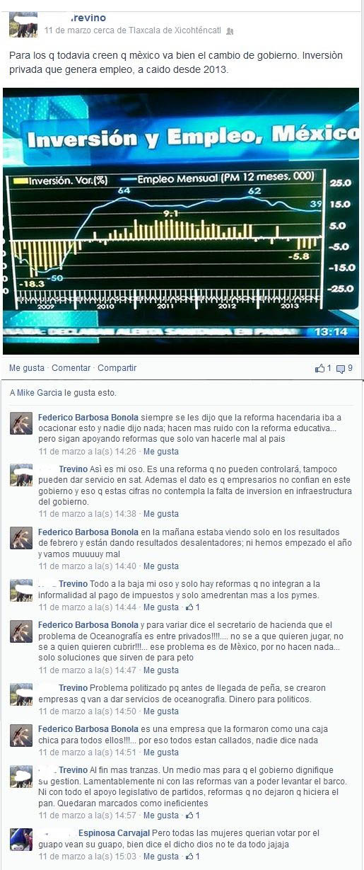 A este medio de comunicación hicieron llegar una conversación en Facebook en la que el perfil que se presume como Federico Barbosa Bonola arremete en contra de las Reformas impulsadas por el Partido Revolucionario Institucional (PRI) a través del gobierno federal, siendo que su familia se presume ha vivido por años de ser parte del gobierno, siendo que hasta el momento dos integrantes del clan Barbosa tienen su sustento de la política.