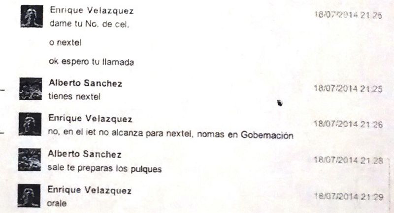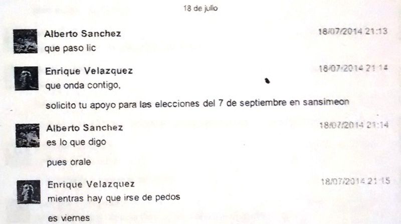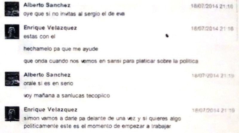 Según la charla en la red social Enrique Velázquez, solicitó la ayuda del gobierno priista a través de Alberto Sánchez, quien funge como director administrativo de la dirección de gobernación; “solicito tu apoyo para las elecciones del 7 de septiembre en San Simeón”.