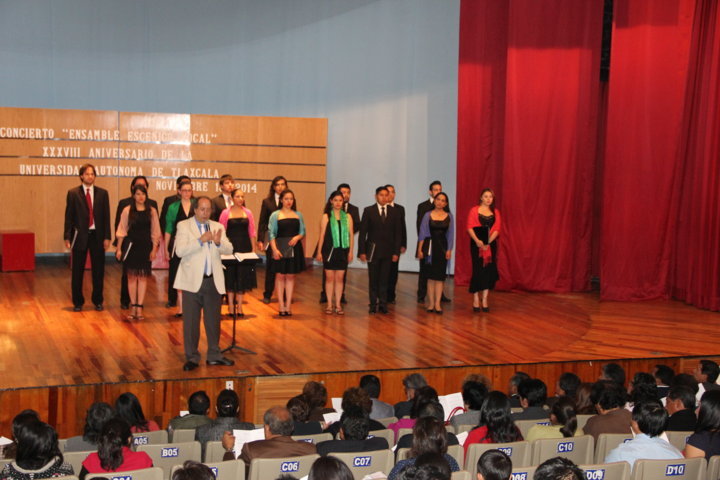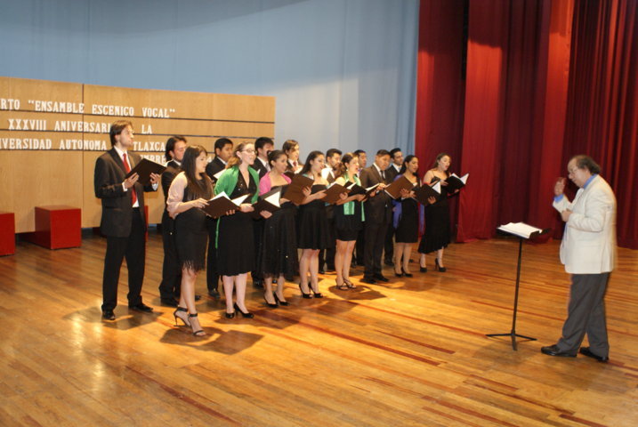 Un deleite para el oído resultó la presentación del Ensamble Escénico Vocal del Sistema Nacional de Fomento en el marco de los festejos por el XXXVIII aniversario de la Universidad Autónoma de Tlaxcala. El público asistente al Teatro Universitario disfrutó de la música coral a capella que interpretaron 16 jóvenes cantantes bajo la dirección del maestro Jorge Córdoba Valencia.