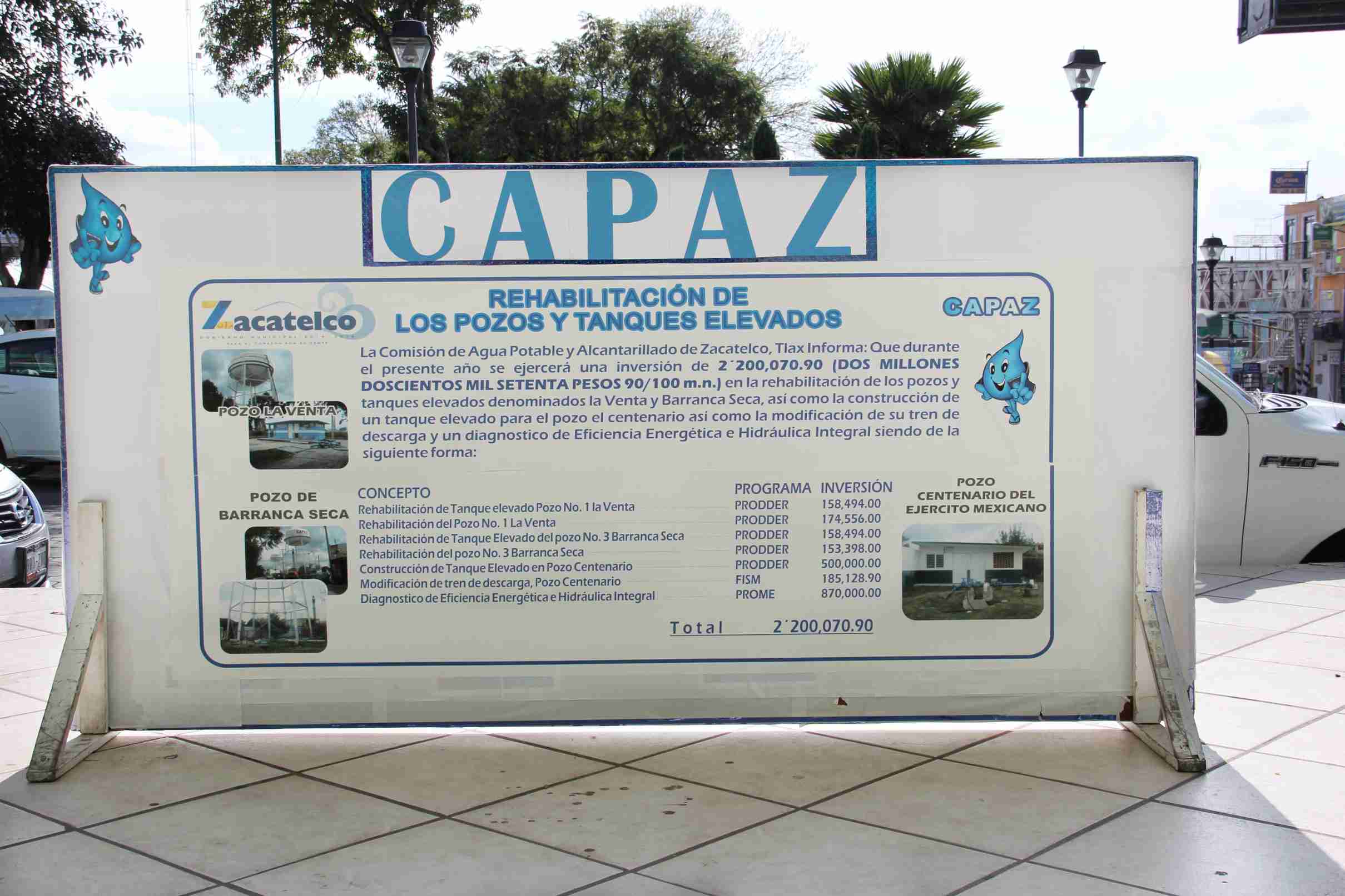 Con una inversión total 2 200 070 pesos, se han realizado los trabajos de rehabilitación de pozos y tanques de Barranca Seca y La Venta, así como el próximo diagnóstico a realizarse para saber la eficiencia energética e hidráulica del vital líquido del municipio de Zacatelco.