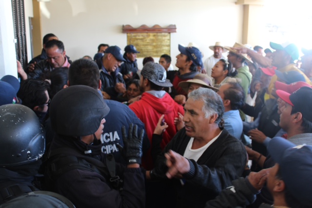 Vecinos irrumpieron este miércoles de manera agresiva en la Presidencia Municipal, incluso con el uso cohetones a modo de proyectiles para ejercer presión, por lo que fue necesaria la presencia policiaca estatal para contener los ánimos.