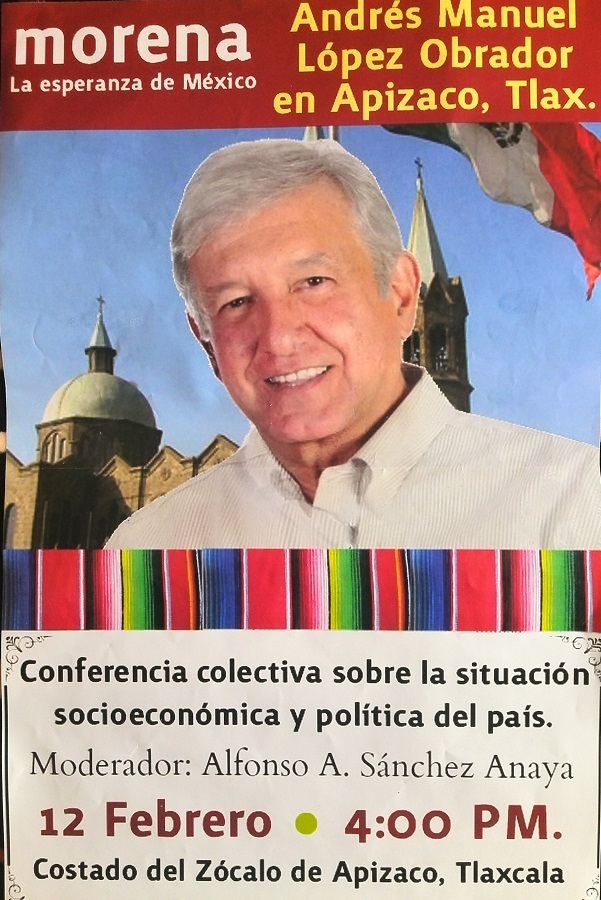 El presidente del Consejo Nacional de MORENA, Andrés Manuel López Obrador, como parte de su gira nacional para exponer la “Conferencia colectiva sobre la situación socioeconómica y política de México”, estará este jueves 12 de febrero en el centro de la ciudad de Apizaco, Tlaxcala, en punto de las 16:00 horas