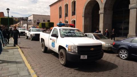 Presidentes de comunidad de Tlaxco a bordo de sus patrullas, se manifestron esta mañana frente al Congreso del estado para anunciar que desconocen la autoridad del alcalde panista Jorge Rivera Sosa, ppr conducirse de manera autoritaria y prepotente al interior del Cabildo.
