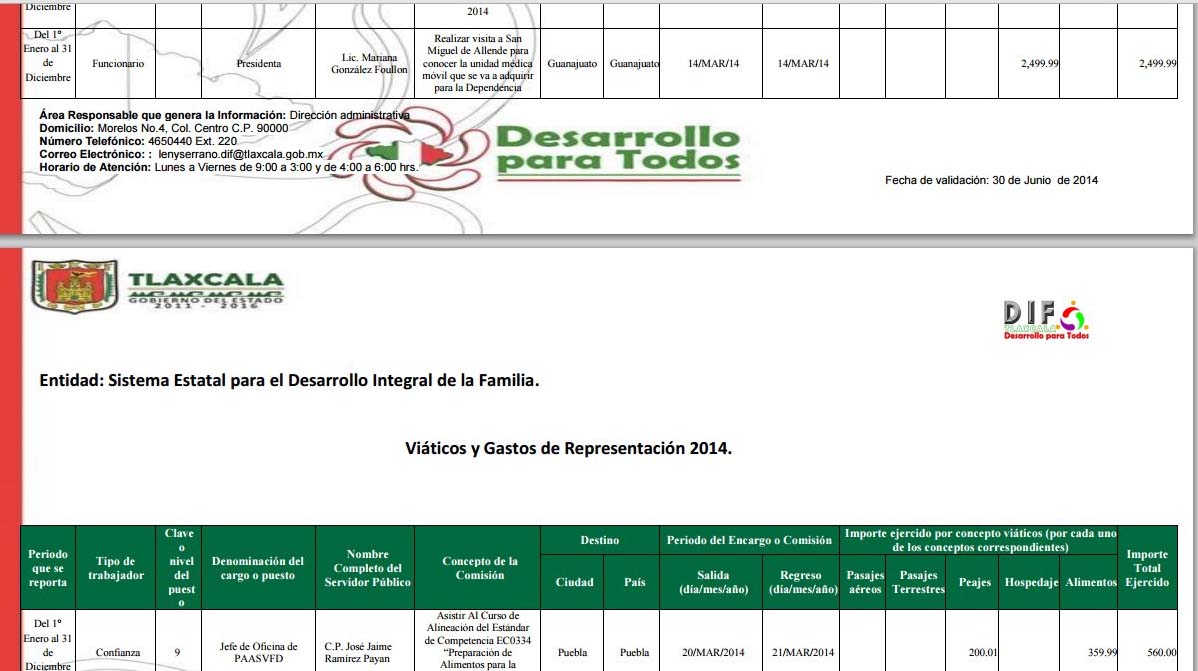 En una salida del 18 de marzo de 2014 y el regreso un día después, la directora de esta dependencia, Liliana Lezama Carrasco asistió a la primera reunión de titulares de los sistemas estatales DIF a la ciudad de México, en donde nuevamente no se detalla el gasto en combustible y el concepto de peajes es por 902 pesos, siendo que la Secretaría de Comunicaciones y Transportes (SCT) dice que el costo actual de las casetas es de 60 pesos para la de Texmelucan y 100 pesos para la de San Marcos, 160 pesos, cifras que no cuadran y no son explicadas en el portal de transparencia.