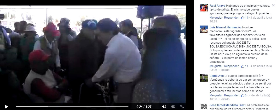 Esta filmación que dura 1:27 minutos, ha sido compartido en Facebook en 419 ocasiones, generando un total de 13 mil 937 reproducciones y una serie de comentarios, la mayoría en contra de la actitud mostrada por el mandatario cuando fue increpado por una señora del municipio de Xicohtzinco a quien en las redes sociales le aplauden por la valentía mostrada para enfrentar el temperamento de Mariano.