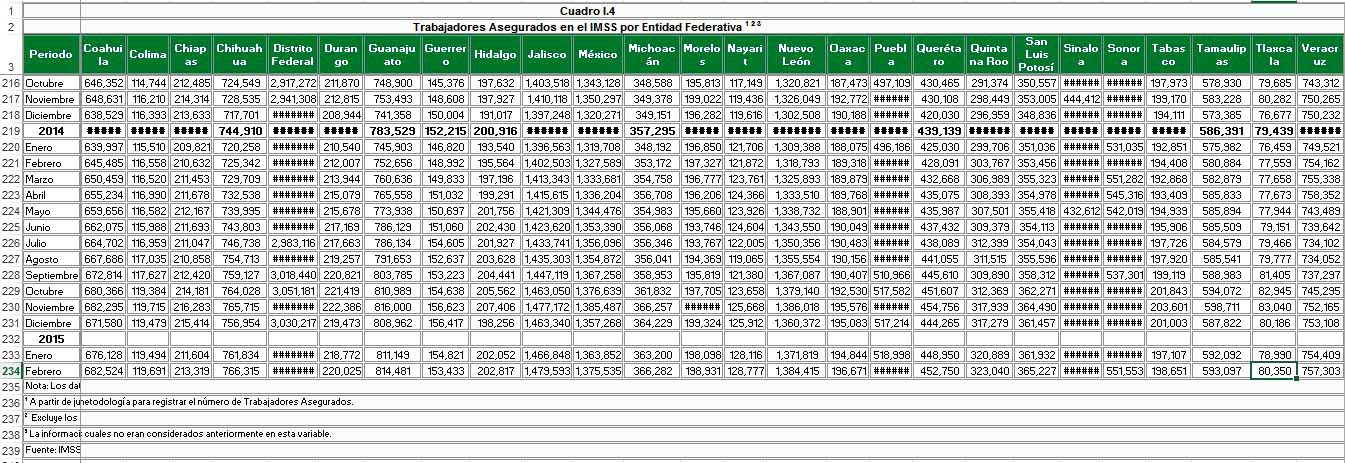 Incluso menciona la propaganda priísta la palabra “empleos formales”, lo cual aunque en las líneas tenga ese significado, la realidad es que hay una importante volatilidad y como muestra es que tan sólo en el mes de enero la cifra de asegurados al IMSS fue de 78 mil 990, mientras que en diciembre fueron 80 mil 186, lo que demuestra que del último mes de 2014 al primero de 2015 se perdieron mil 196 pero de enero a febrero se lograron mil 360, datos que evidencian que no hay como tal una formalidad.