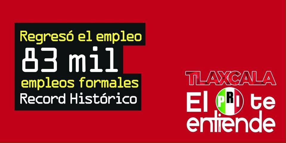 El dinosaurio una vez más muestra la capacidad para tratar de engañar a la ciudadanía, máxime que hay un proceso electoral federal, en esta ocasión a través de espectaculares que dispusieron a lo largo del territorio tlaxcalteca en donde se presume “Regresó el empleo 83 mil empleos formales, Record Histórico”, lo que no cuadra con las cifras que otorga la Secretaría del Trabajo y Previsión Social (STyPS) que muestra lo desfasado que tienen los números del partido en el poder.