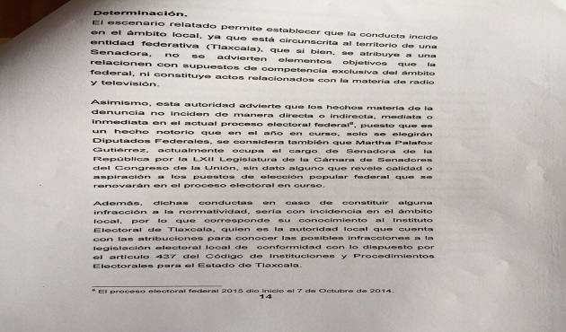 La resolución del TEPJF declaró la denuncia del revolucionario institucional fuera de su esfera de competencia debido a que Palafox Gutiérrez, actualmente ocupa el cargo de Senadora de la República y no existe dato alguno que revele su aspiración a cargos de elección popular en el proceso federal 2015.