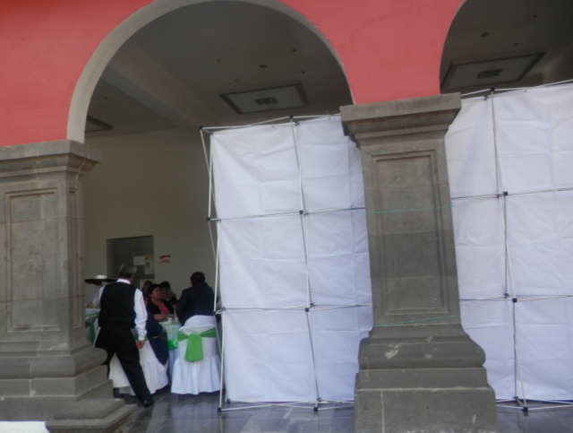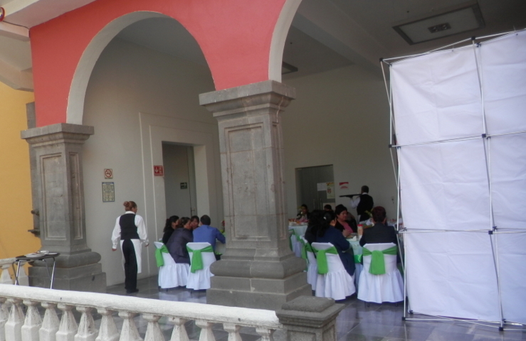 Poco a poco fueron bajando la mantelería, mesas redondas, sillas, cubiertos y sillas adornadas con un gran moño verde, también se instalaron bocinas para actuaciones musicales.