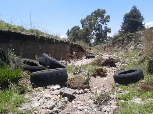 Teodoro García Mora, técnico de Protección Civil, indicó que ya habían recibido el reporte de que en esta barranca que bordea las vías del tren, justo a la altura de la ex fábrica Taurus, personas desconocidas acostumbran tirar llantas a cielo abierto.