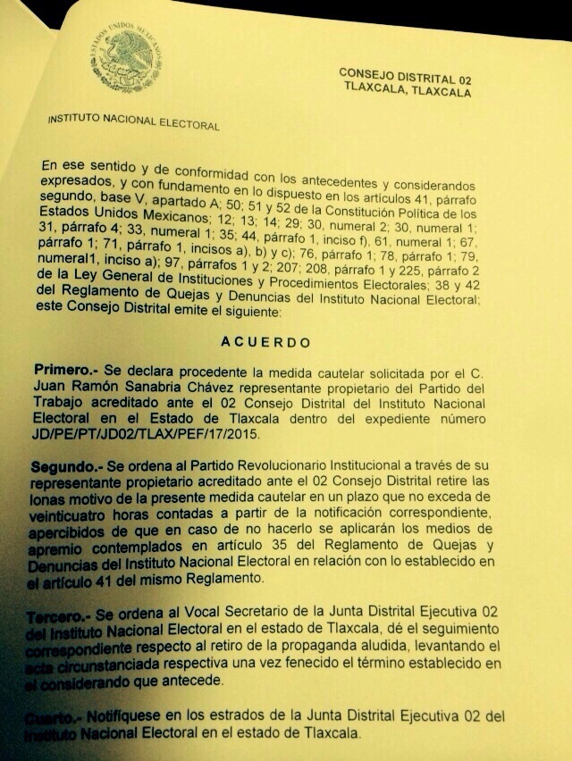 La medida cautelar fue aprobada hace unos momentos en la sesión del Consejo Distrital Número Dos del Instituto Nacional Electoral (INE), una vez que dieron cause a la queja que por tal violación presentó el sábado pasado el Partido del Trabajo (PT) mediante su representante Juan Ramón Sanabria.