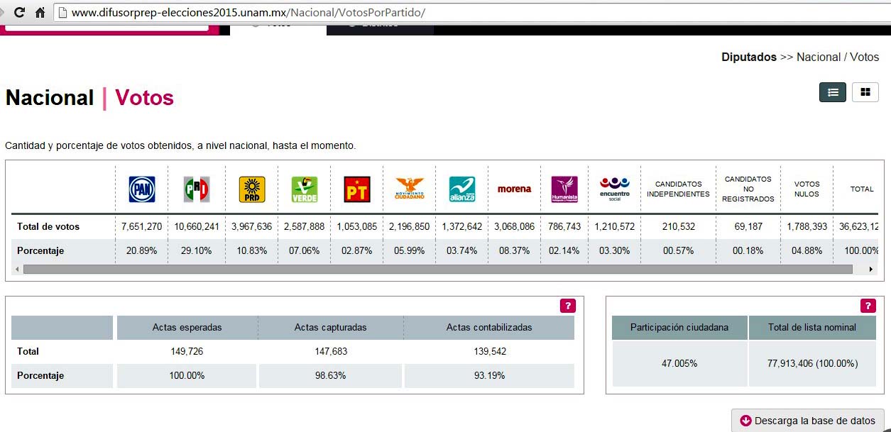 Con el 93.19 por ciento de las actas contabilizadas a nivel nacional, el partido de la estrella cuenta con un total de un millón 53 mil 85 votos que es equivalente al 2.87 por ciento de la votación, por lo que no cumpliría hasta el momento con lo que pide la ley que es el 3 por ciento de los sufragios emitidos para mantener su registro.
