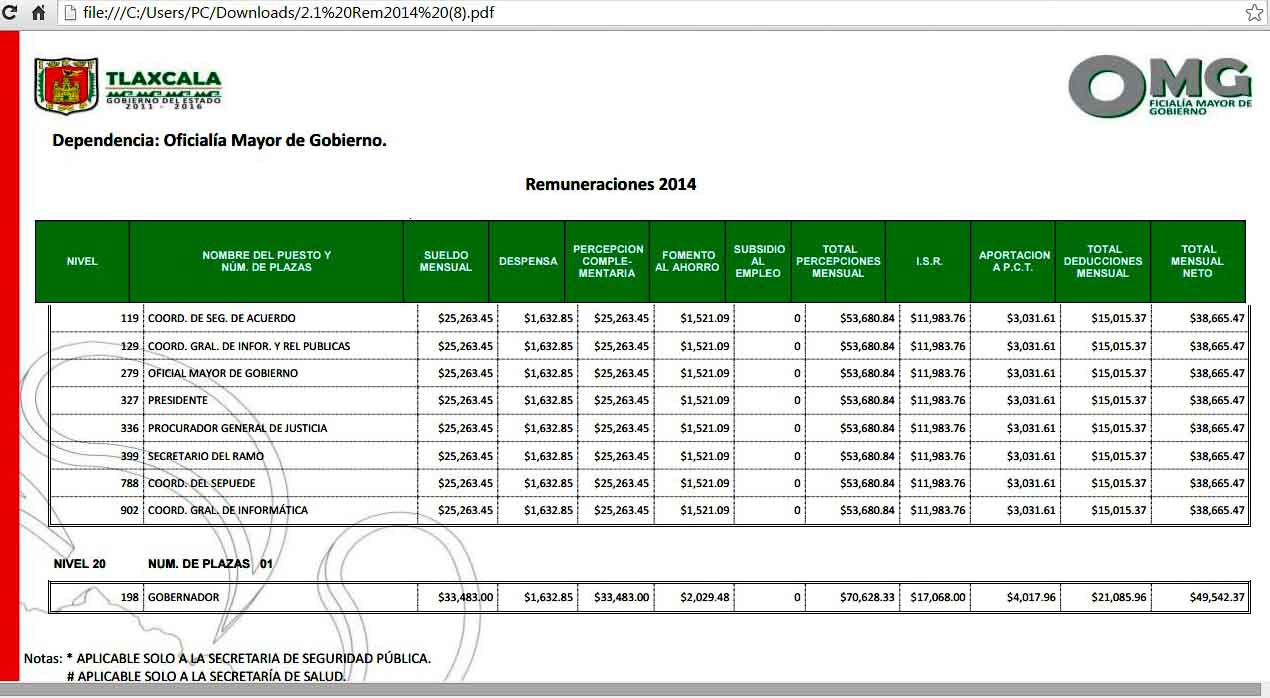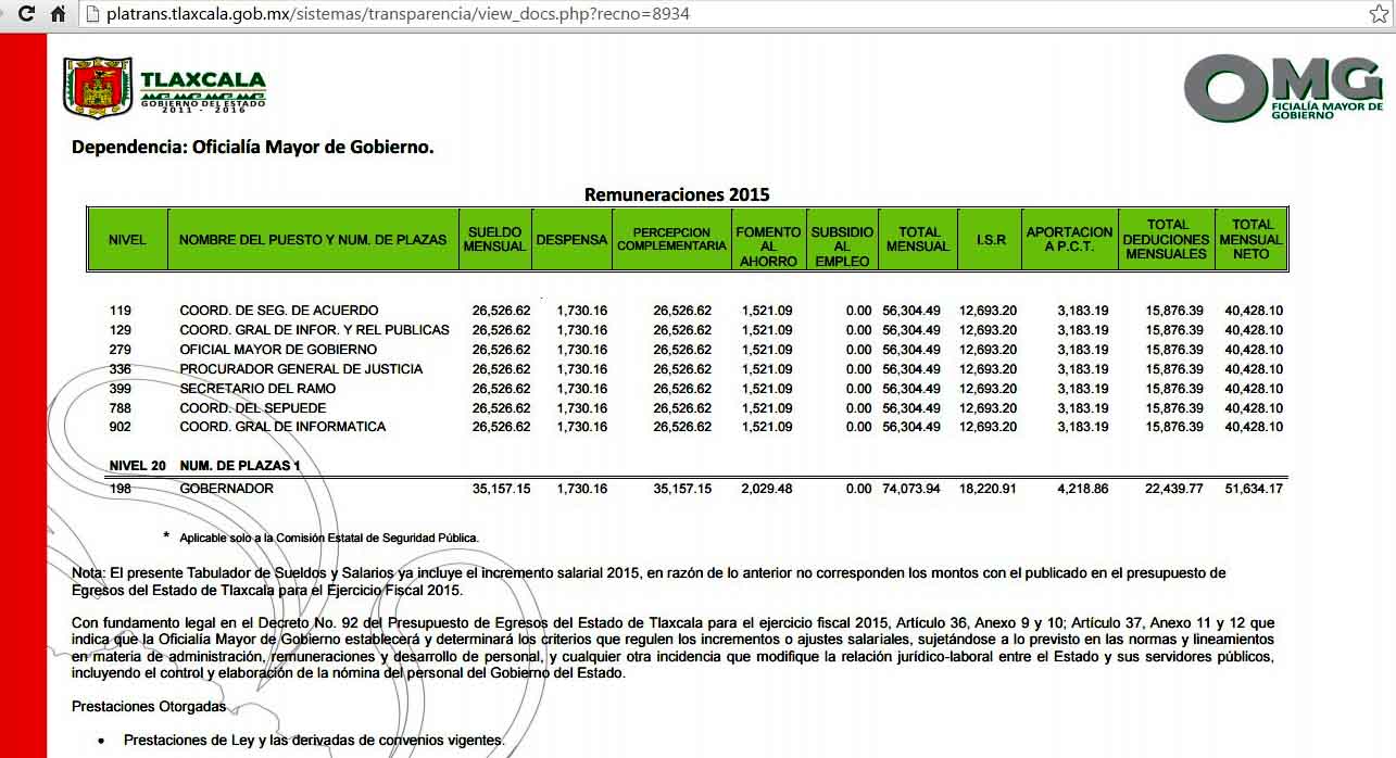 De acuerdo con datos de la Oficialía Mayor del Gobierno del estado, el titular del Poder Ejecutivo en Tlaxcala percibe mil 721.12 pesos diarios que equivalen a 51 mil 634.17 pesos mensuales ya como salario neto, mientras que para 2014 sus percepciones del mandatario eran por 49 mil 542.37 pesos, lo que quiere decir que su sueldo aumentó en alrededor de un cuatro por ciento que en términos brutos significó una diferencia de dos mil 091.80 pesos.