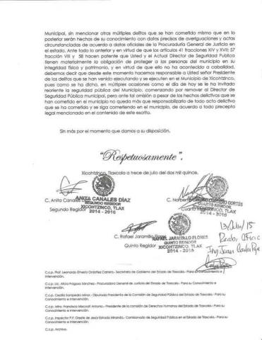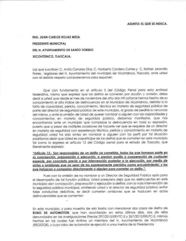 Los regidores del municipio de Xicohtzinco Anita Canales Díaz, Norberto Cordero Cortés y Rafael Jaramillo Flores, enviaron un documento dirigido al presidente municipal Juan Carlos Rojas Meza, pidiendo la destitución del director de Seguridad Pública Aldrin Bautista Domínguez, ya que manifiestan que en esta demarcación se ha incrementado la inseguridad.