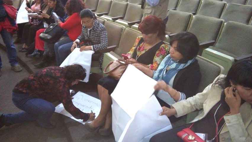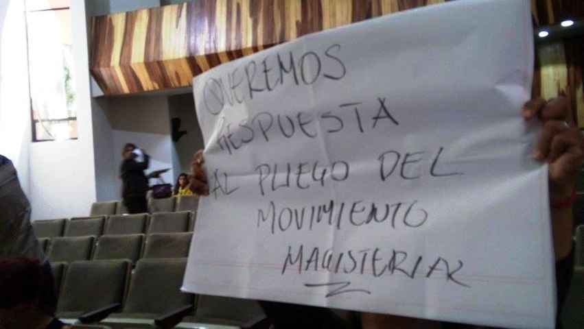 Integrantes del Comité de Lucha de la Coordinadora Nacional de Trabajadores de la Educación (CNTE), protagonizaron una protesta silenciosa en el salón de sesiones del Congreso del estado, con pancartas en mano exigieron a los congresistas solución a su pliego petitorio el cual, entre otras cosas, prevé frenar la aplicación de pruebas a los docentes.