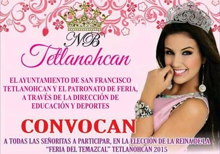 El Patronato de Feria del ayuntamiento de Tetlanohcan, a través de la Dirección de Educación y Deportes, dio a conocer la convocatoria para elegir a la reina de “La Feria del Temazcal 2015”, por lo que las aspirantes de 18 a 23 años de edad podrán inscribirse en las instalaciones de la presidencia municipal.