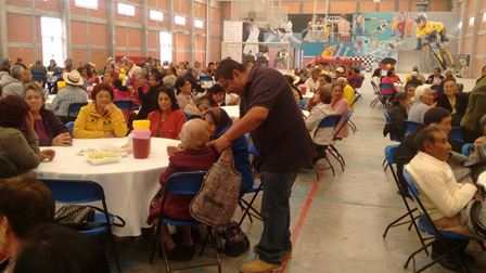 Después de la inauguración el personal del Ayuntamiento trasladó a los abuelitos al auditorio, donde empezó la fiesta en grande. Ahí los adultos mayores degustaron una rica comida hecha por personal del DIF municipal, el munícipe les obsequio un chaleco de lana que los protegerá de los próximos fríos.