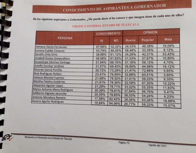Lorena Cuéllar es conocida por un 53.7 por ciento, la opinión buena de ella es de 58.4 por ciento, la regular es de 33.3 por ciento y la mala es 8.1 por ciento; los encuestados tienen un conocimiento sobre Anabell Ávalos de un 38 por ciento, la opinión positiva es de 31.5 por ciento, la regular de 57.6 por ciento y la negativa de 10.8 por ciento; mientras que Guadalupe Sánchez es conocida por un 31.8 por ciento, teniendo una opinión buena de 37.1 por ciento, regular de 58.1 por ciento y mala de 4.7 por ciento.