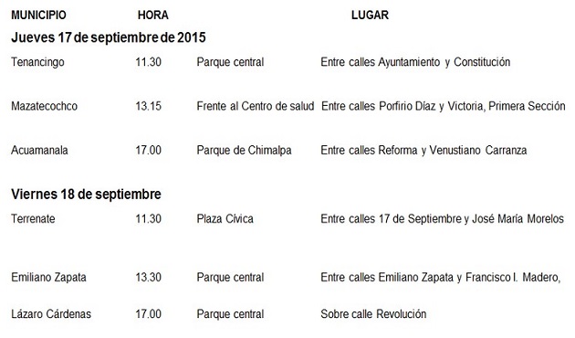 La gira que comenzará en el municipio de Tenancingo este próximo jueves 17 de septiembre tendrá por sedes las siguientes direcciones: