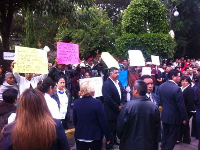 Adultos mayores del municipio de Tlaltelulco aprovecharon el desfile que se llevó a cabo en el centro de la localidad para manifestar su malestar con el presidente municipal, Miguel Ángel Polvo Rea por no cumplir con los compromisos que adquirió con ellos durante su campaña política para llegar a la alcaldía.