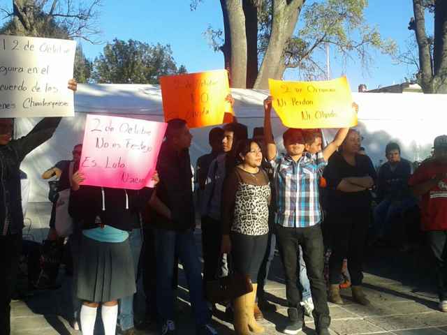 Estudiantes del Instituto Paceli, grupos de las diferentes comunidades de Chiautempan y la sociedad civil organizada mostraron su respeto con pancartas a manera de recordatorio: " 2 de octubre, ni perdón ni Olvido" "2 de octubre no se olvida" "2 de octubre no es festejo, es luto Nacional".