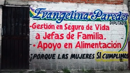 “Evangelina Paredes Zamora, diputada gestión de seguro de vida a jefas de familia. Apoyo en alimentación porque las mujeres si cumplimos”, reza el mensaje que en diversas calles de la comuna se pueden observar.