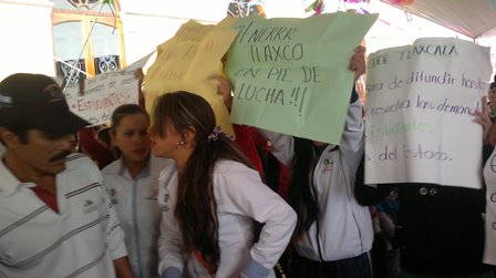Tlaxco, Tlaxcala.- Esta tarde estudiantes de la Federación Nacional de Estudiantes Revolucionarios “Rafael Ramírez” (FENERRR), se manifestaron en la plaza central de Tlaxco para exigir una solución a sus demandas planteadas al gobierno municipal desde hace dos años, en la búsqueda de apoyos para los planteles de Atotonilco, El Peñón y el Cecyte del Rosario.