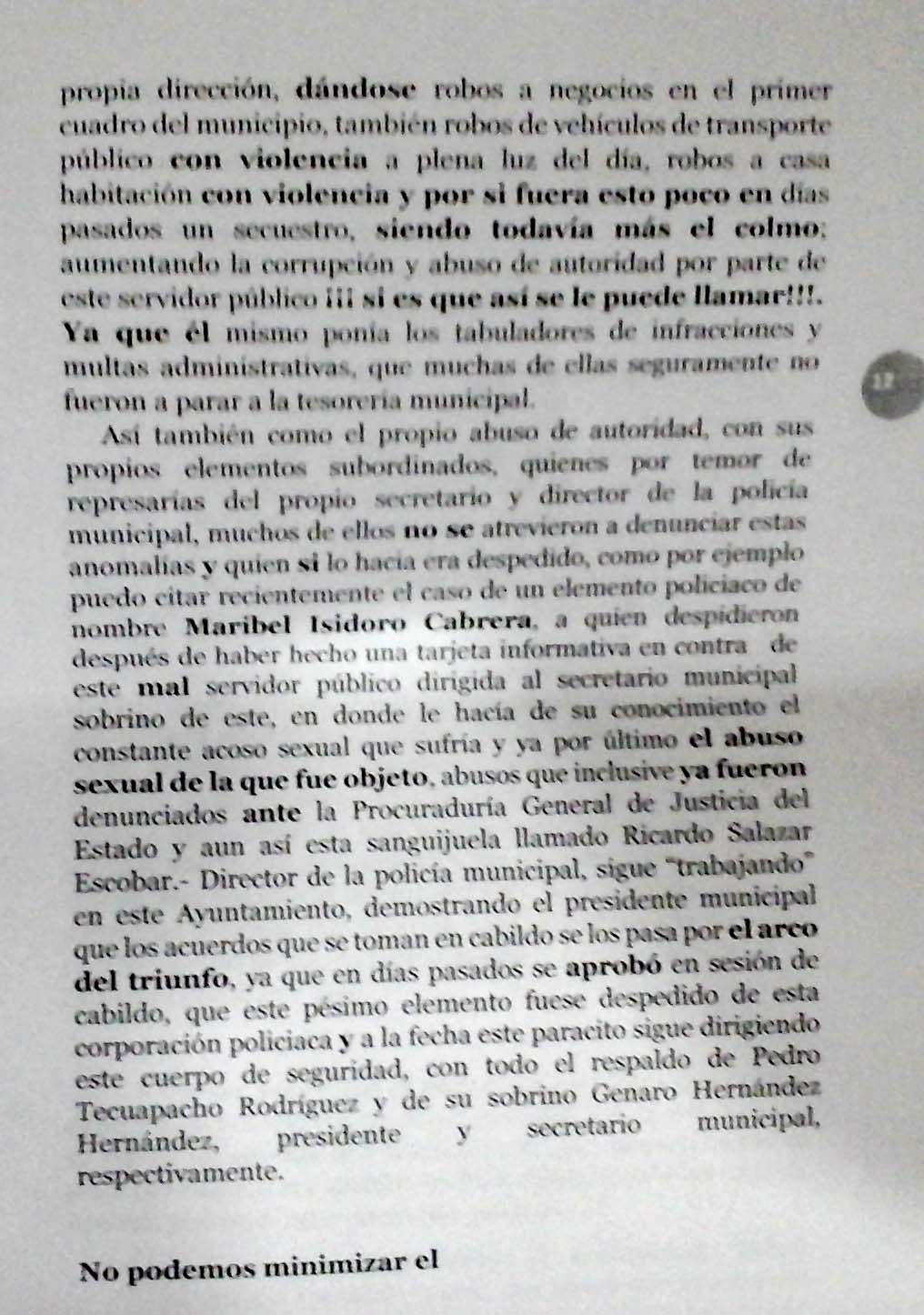 Debido a que el munícipe supuestamente solapa las actitudes de su jefe de policía, Maribel Isidoro no encontró el apoyo para que se detuvieran los abusos en su contra y luego de ser despedida después de lo que había tenido que soportar, acudió a la PGJE para hacer la denuncia correspondiente para que no quede impune su caso y no siga aprovechándose del cargo para delinquir impunemente.