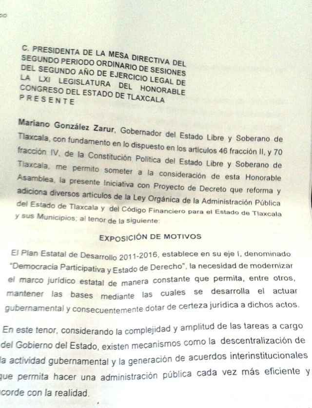 El titular del Ejecutivo local hizo llegar a la presidenta de la Mesa Directiva del Congreso del estado, María Antonieta Maura Stankiewicz Ramírez, una iniciativa con proyecto de decreto para reformar y adicionar diversos artículos de la Ley Orgánica de la Administración Pública del Estado de Tlaxcala y del Código Financiero para el Estado de Tlaxcala y sus Municipios, con el propósito de rediseñar las atribuciones de las dependencias antes citas.