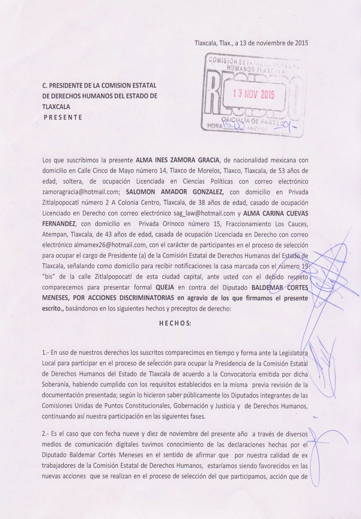 Los aspirantes a presidir la CEDH, mencionan que “con fecha 9 y 10 de noviembre del presente año a través de diverso medios de comunicación digitales tuvimos conocimiento de las declaraciones hechas por el diputado Baldemar Cortés Meneses en el sentido de afirmar que por nuestra calidad de ex trabajadores de la Comisión Estatal de Derechos Humanos, estaríamos siendo favorecidos en las nuevas acciones que se realizan en el proceso de selección del que participamos, acción que de acuerdo a lo que establece la normatividad internacional, nacional y estatal constituye un acto discriminatorio como a continuación se aprecia”.