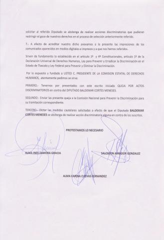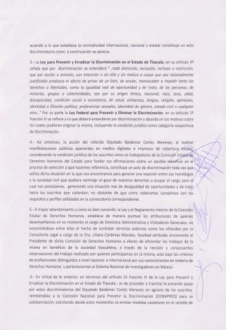 “Así entonces, la acción del referido Diputado Baldemar Cortés Meneses, al realizar manifestaciones públicas aparecidas en medios digitales e impresos de cobertura estatal, considerando la condición jurídica de los suscritos como ex trabajadores de la Comisión Estatal de Derechos Humanos del Estado para fundar sus afirmaciones sobre un posible beneficio en el proceso de selección a que hacemos referencia, constituye un acto de discriminación toda vez que utiliza dicha situación en la que nos encontramos para generar una reacción entre sus homólogos y la sociedad civil que pudiera restringir el goce de nuestros derechos a ocupar el cargo para el cual nos postulamos, generando una situación real de desigualdad de oportunidades y de trato hacia los suscritos que violentan”, señalaron los quejosos.