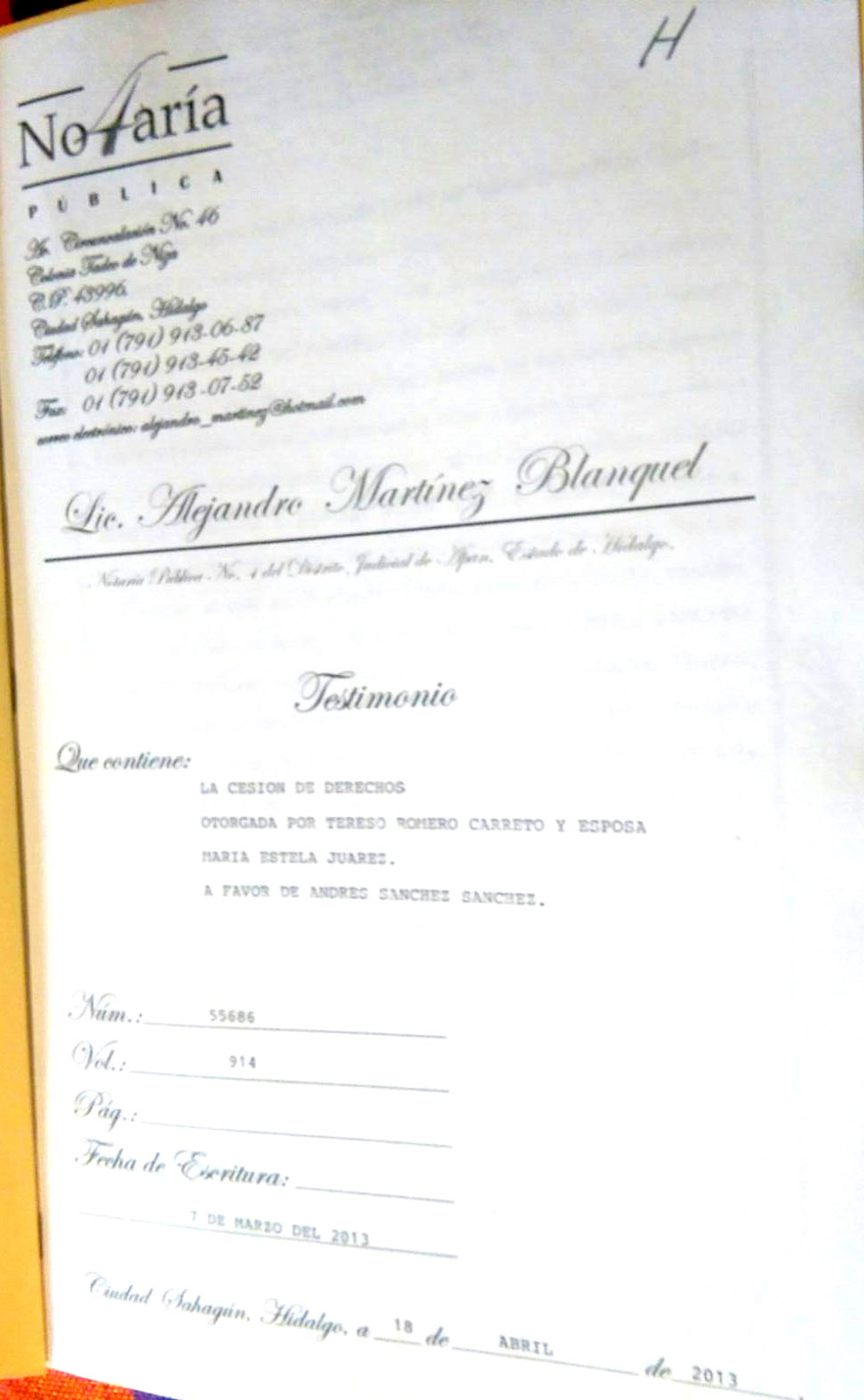 El perredista señaló que el predio tiene escritura notarial con el número 55686, volumen 914 con fecha de 7 de marzo de 2013 de la Notaria Pública número 4 del Distrito Judicial de Apan en el estado de Hidalgo, por lo que cuenta con todos la reglamentación legal.
