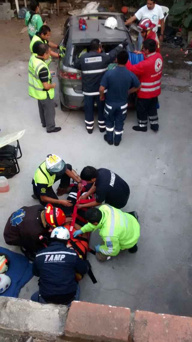 Paramédicos simularon un accidente vial entre dos carros donde el conductor resultó prensado y el cual tuvieron que extraer con vida utilizando el equipo “libra”, sin lastimar a la persona.