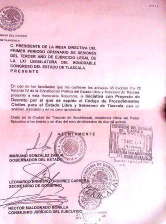 Con el propósito de que las y los tlaxcaltecas recobren la confianza en las instituciones y aumentar la competitividad del estado, el gobernador Mariano González Zarur presentó al Poder Legislativo local una iniciativa con proyecto de decreto para la expedición del Código de Procedimientos Civiles para el Estado de Tlaxcala.