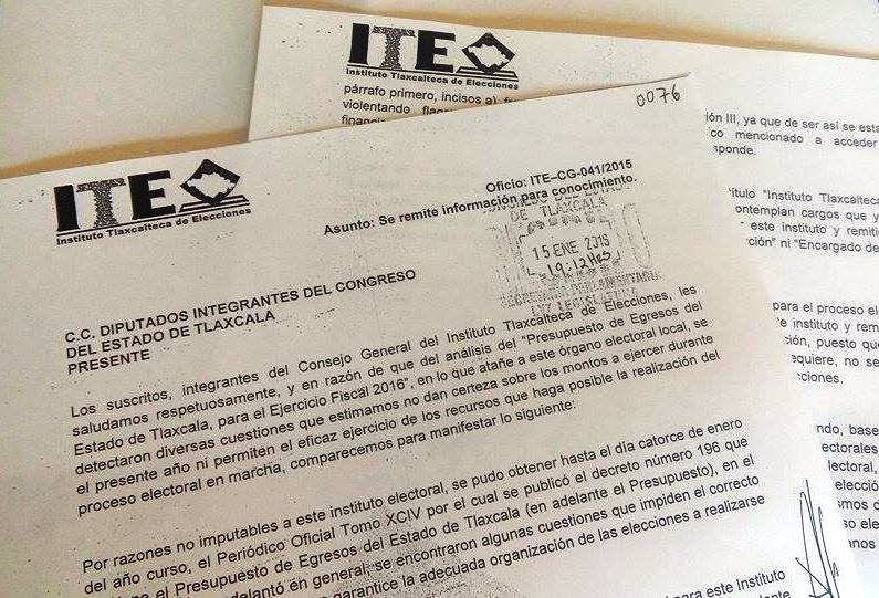 El oficio ITE-CG-041/2015 firmado por los integrantes del Consejo General del ITE, fue recibido en la Secretaría Parlamentaria, a través del cual exponen las diversas cuestiones que detectaron en la revisión del decreto 196 que contiene el Presupuesto de Egresos de 2016 en el que se encontraron cuestiones que impiden el correcto funcionamiento institucional que garantice la adecuada organización de las elecciones a realizarse el presente año.