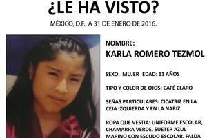 Karla Romero Tezmol, de 11 años de edad, fue secuestrada por un grupo de sujetos el pasado 13 de enero, mientras iba rumbo a su escuela en San Pablo del Monte.