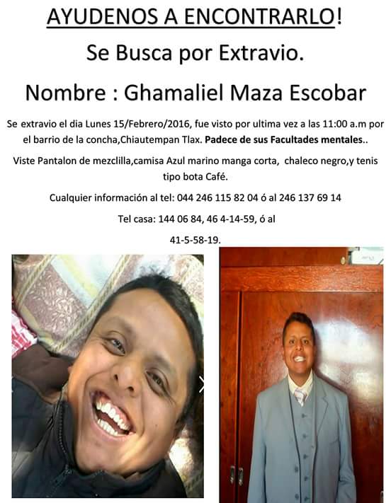 A través de las redes familiares y amigos buscan a Ghamaliel Maza Escobar quien la última vez que lo vieron fue el pasado lunes 15 de febrero a las 11:00 horas en el barrio de la concha en Chiautempan.