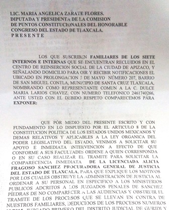 Familiares de los siete ex policías acreditables recluidos en el Centro de Reinserción Social (Cereso) de Apizaco acusados de secuestro en enero de 2015, solicitaron a los integrantes del Congreso local llamar a comparecer a la titular de la Procuraduría General de Justicia del Estado (PGJE), Alicia Fragoso Sánchez, a quien acusan de obstruir la administración de justicia en esos casos a través de la orden a los ministerios públicos de retrasar audiencias.