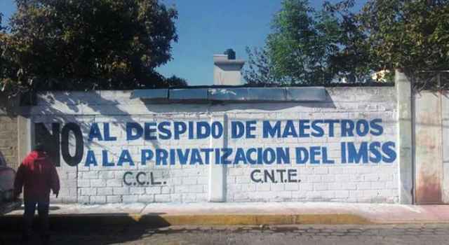 En las muestras de inconformidad también repudiaron la privatización del Instituto Mexicano del Seguro Social (IMSS); “no al despido de maestros, no a la privatización del IMSS”.