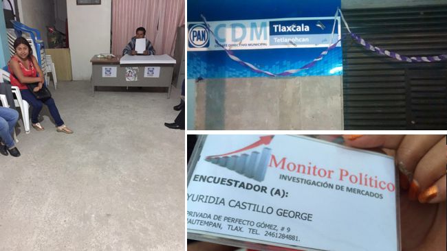 De acuerdo con la información disponible, se sabe que el pasado lunes cerca de las 16 horas se detectó en la calle 16 de Septiembre del municipio de San Francisco Tetlanohcan a un grupo de personas que se identificaron como encuestadores de la empresa “Monitor Político”, Investigación de Mercados, quienes en entrevistas domiciliarias llenaban un cuestionario a través de una tableta electrónica.