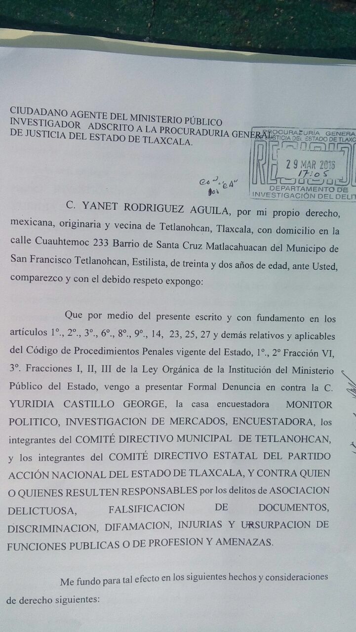 Vecinos de Tetlanohcan presentaron una denuncia ante la Procuraduría General de Justicia del Estado contra Yuridia Castillo George, la casa encuestadora Monitor Político y los dirigentes municipales y estatales del Partido Acción Nacional por los probables delitos de asociación delictuosa, falsificación de documentos, injurias, discriminación, difamación y amenazas.