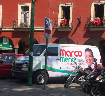 A este medio un grupo de panistas hicieron llegar unas fotografías en las que se muestra un vehículo con la propaganda del candidato priista a la gubernatura Marco Mena, unidad que se encuentra estacionada desde las primeras horas en el primer cuadro de la ciudad capital.
