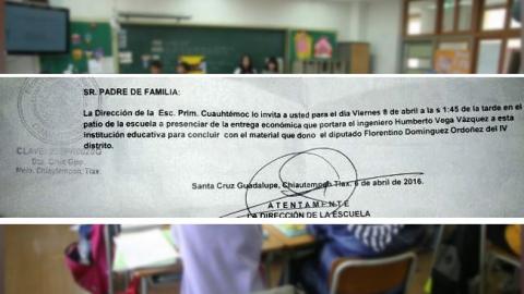 De acuerdo con una invitación que fue girada a los padres de familia por la dirección de la escuela referida con clave 29EFR0028G se pide que asistan este día a las 14:00 horas para presenciar la entrega económica que entregará el ingeniero Humberto Vega Vázquez, para concluir con el material con el material que donó el diputado Florentino Domínguez Ordoñez.