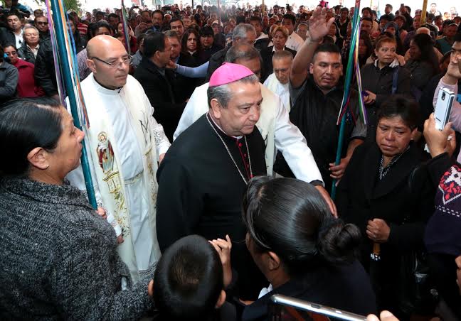 11:30 Un momento de apertura para la familia, en ese momento llega el obispo de Tlaxcala, Francisco Moreno Barrón y momentos más tarde sale para la eucaristía donde confortó a los dolientes.